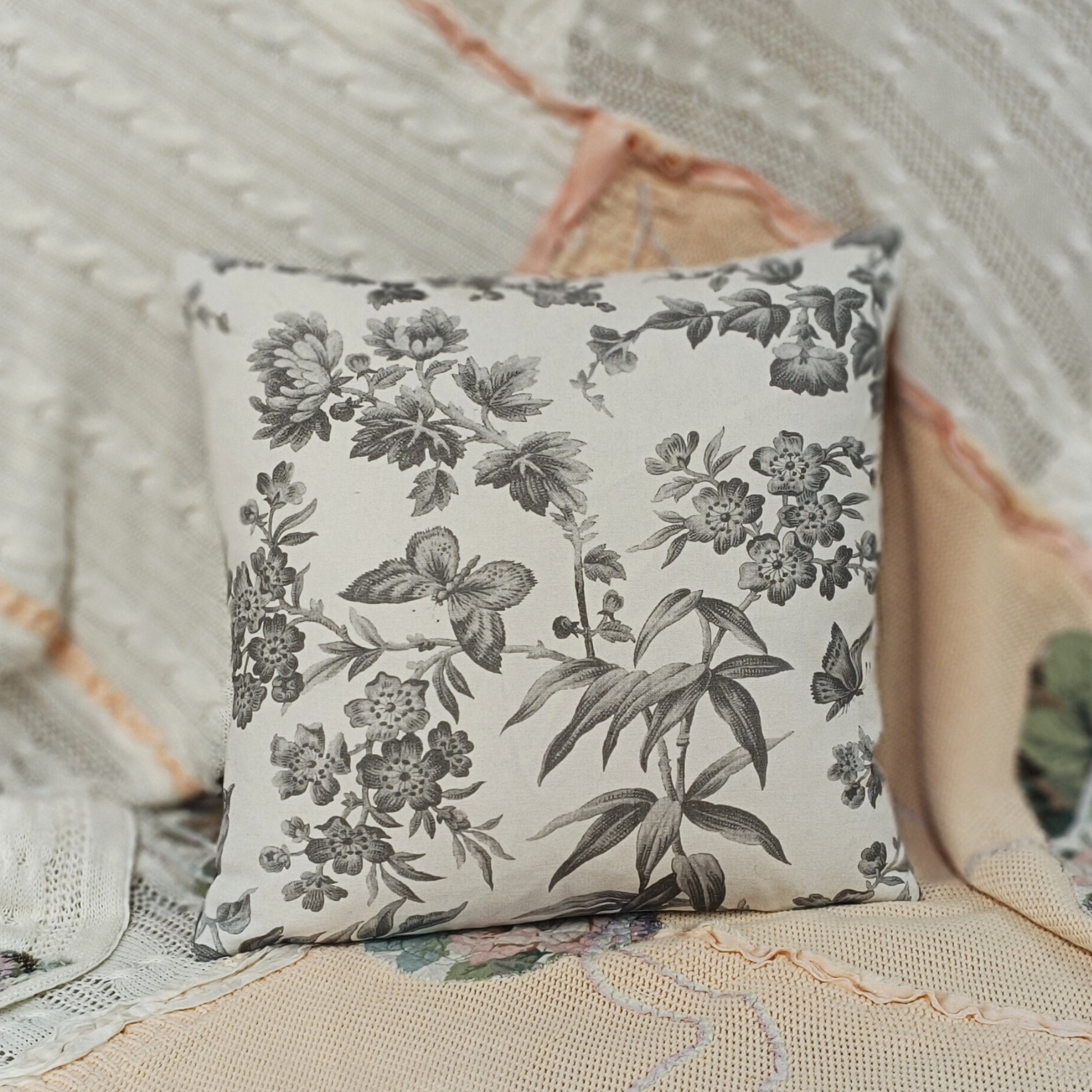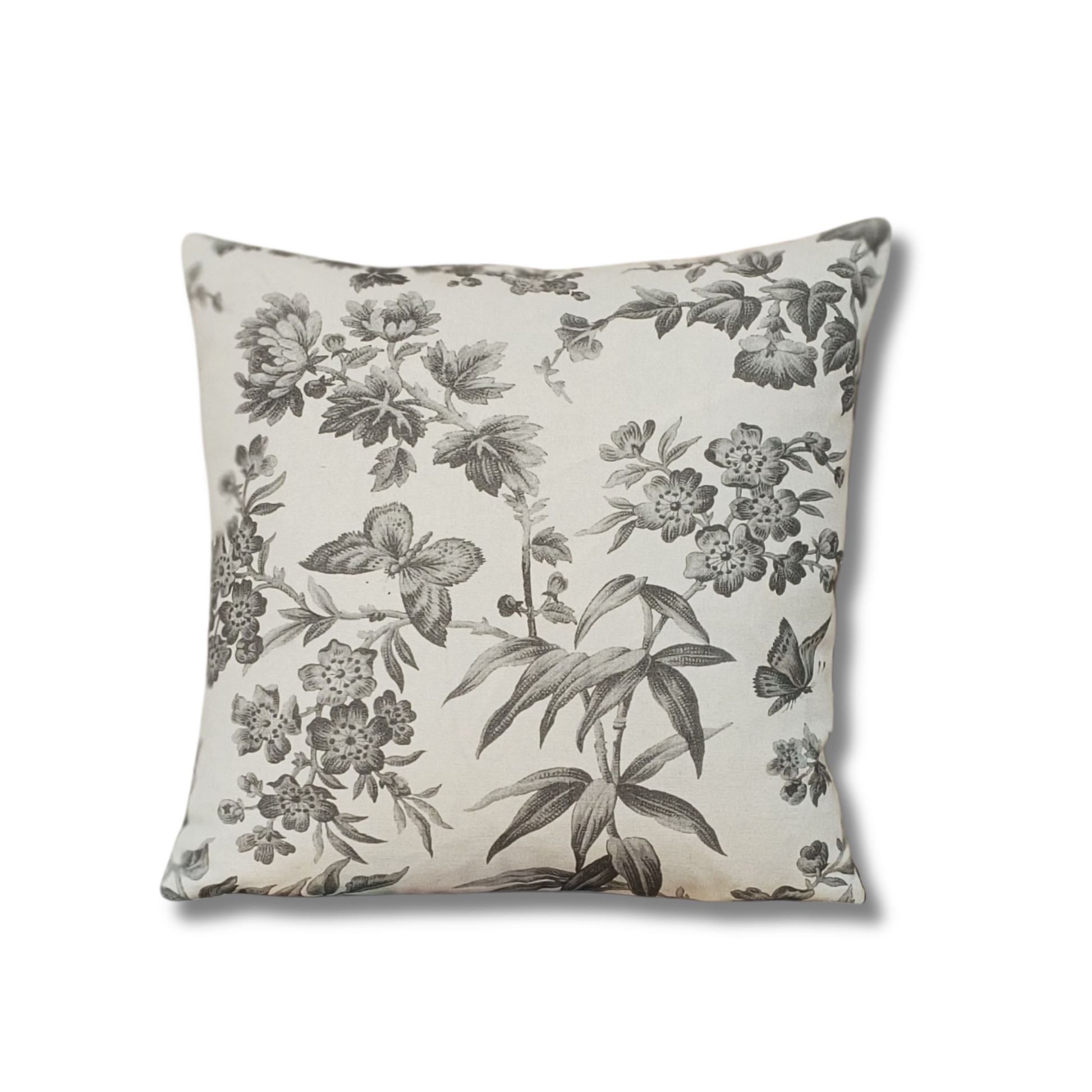 One-of-a-kind: A quiet beauty with a monochrome soul, this cushion brings timeless elegance to your space. Featuring an intricate charcoal floral and butterfly print on a natural base, it’s finished with a charcoal-coloured back, a discreet zip closure, and a luxurious feather inner. Measuring 37cm x 35cm, it's a refined accent that blends classic botanical charm with modern restraint.