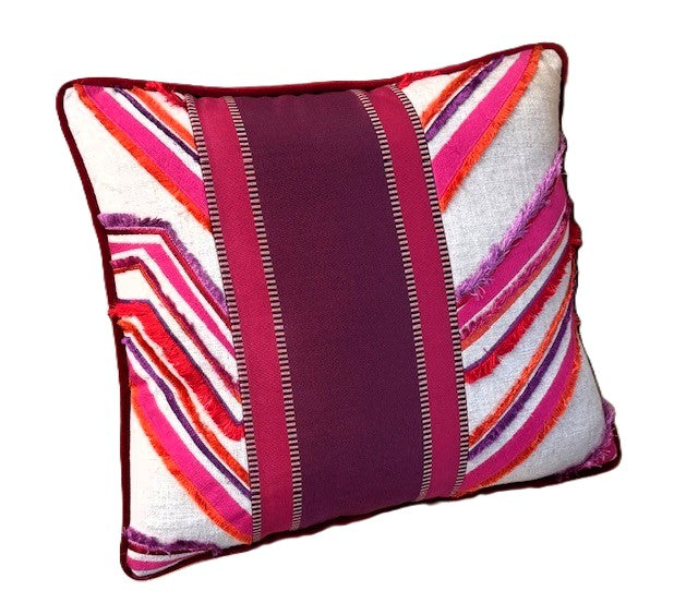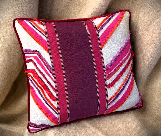 One-of-a-kind: Bold and bright, this 40cm x 38cm cushion features a central plum panel flanked by textured chevron stripes in hot pink, red, orange, and purple. Finished with matching paprika velvet piping, a velvet back, zip closure, and a polyester inner.