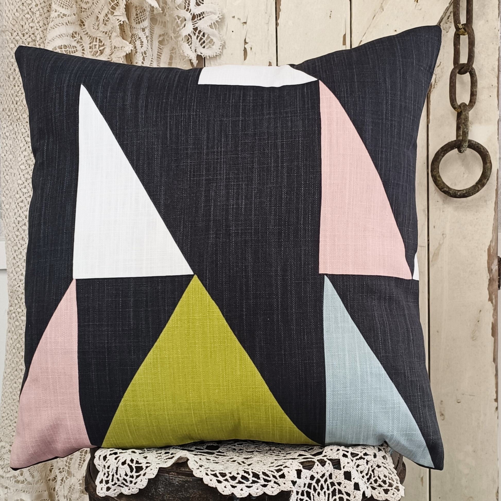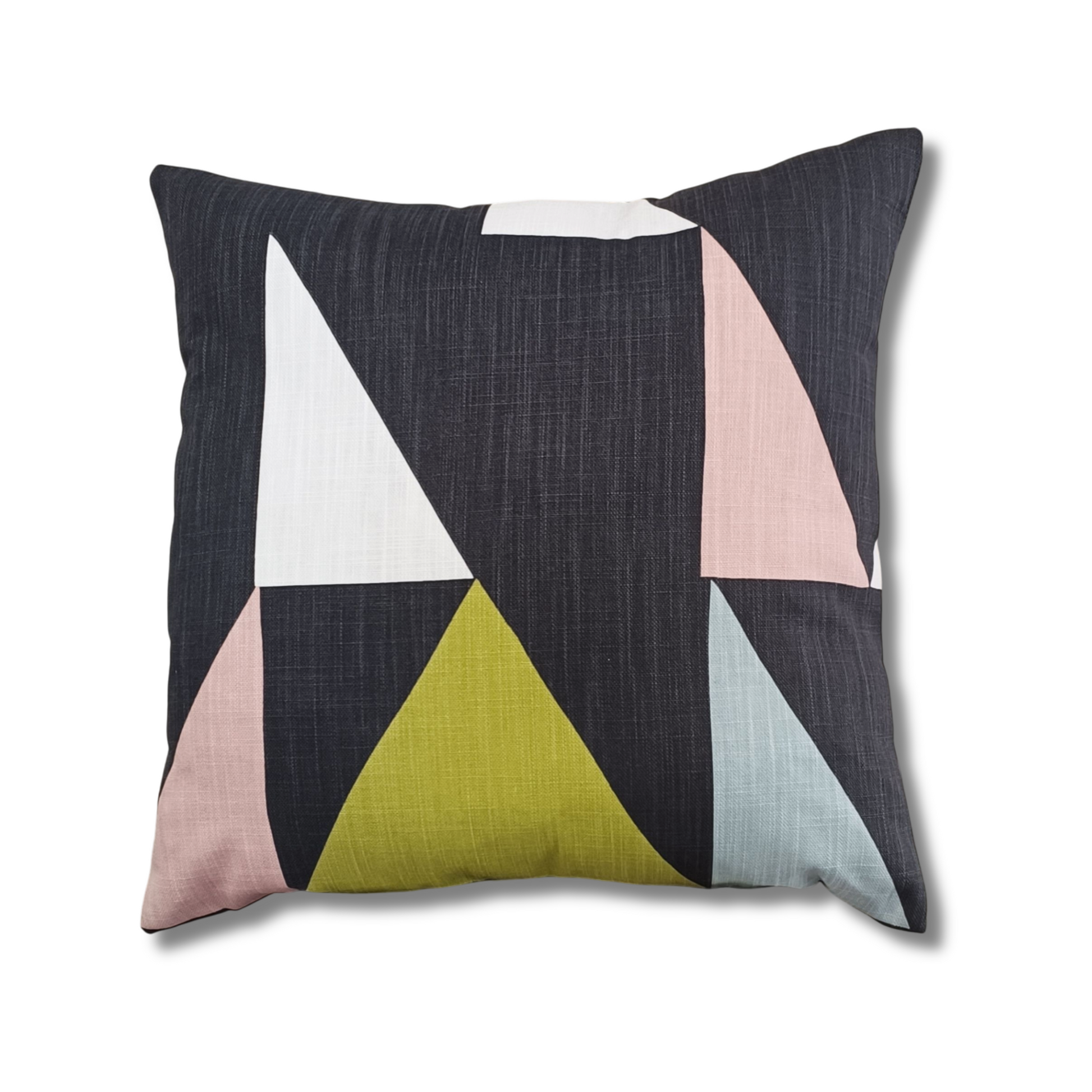 One-of-a-kind: This 40cm x 40cm cushion features a bold geometric design in Apple, Rose and Mist tones on a dark cotton-linen blend front. The back is a plain black Linen. It has a zip closure for easy care and comes with a soft polyester-filled inner making it both stylish and comfortable.