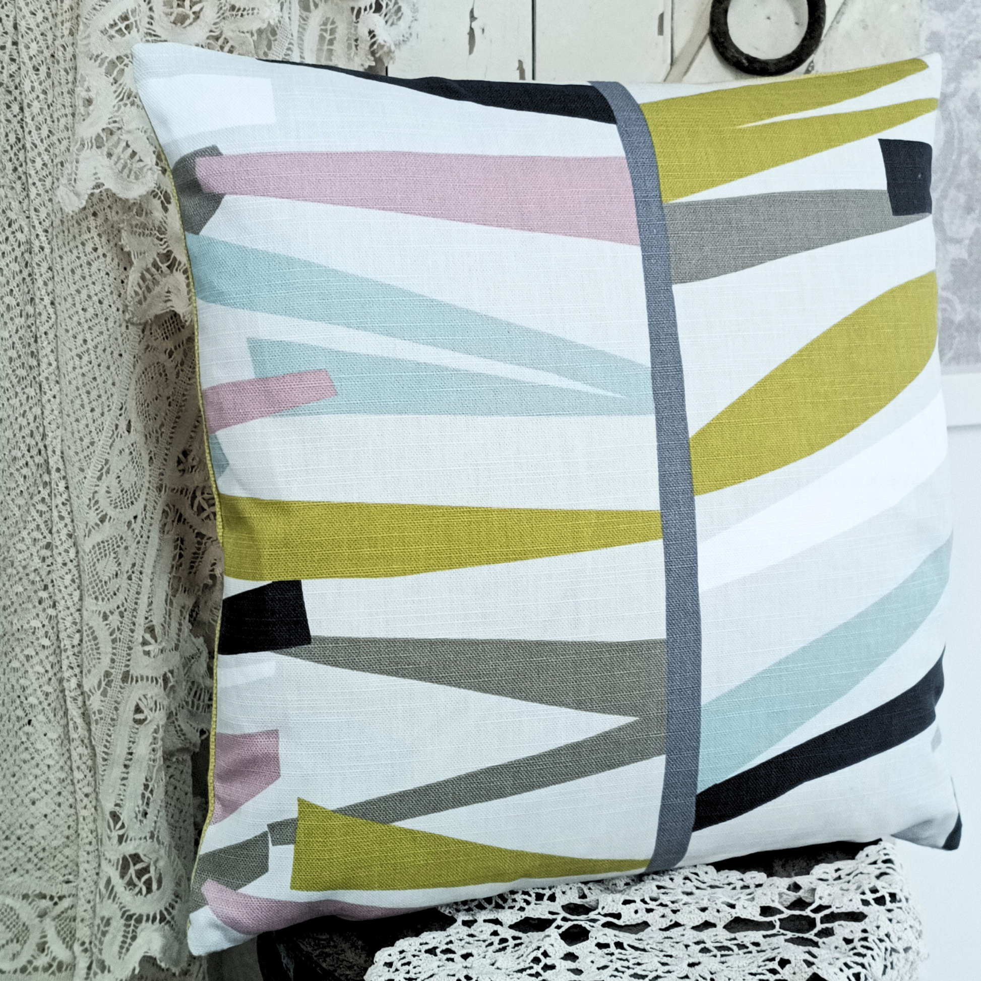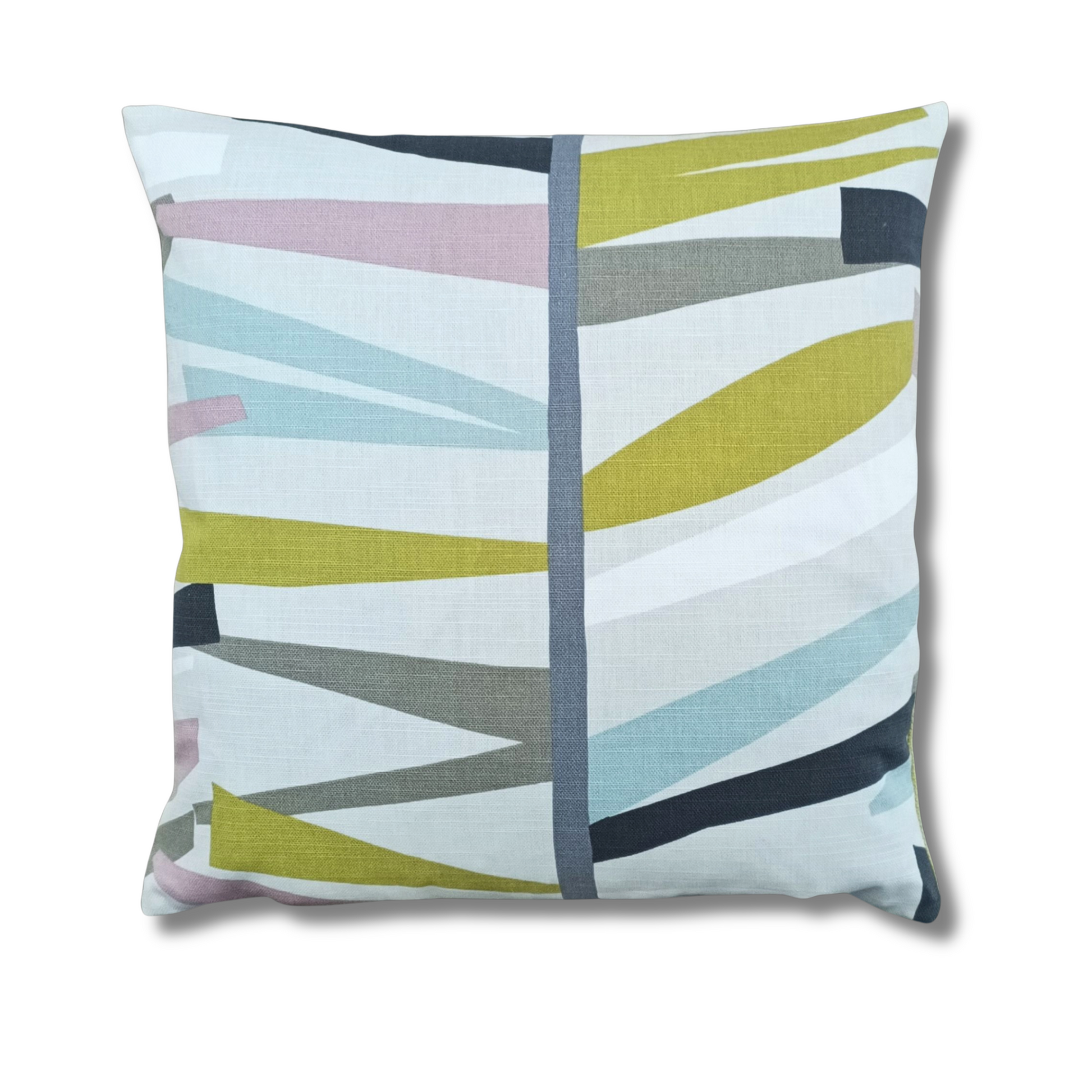 One-of-a-kind: This unique 40cm x 40cm cushion brings a sophisticated touch to any space with its dynamic linear design. The front features a stylish interplay of pear, amethyst, and hessian tones on a crisp white backdrop, creating a modern yet organic aesthetic. A citrus-colored back complements the design, offering a bold contrast. Finished with a convenient zip closure and a luxurious feather inner, this cushion delivers both comfort and style.